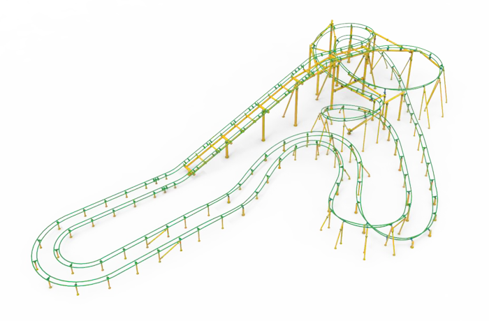 雙軌家庭過(guò)山車(chē),共有A、B兩條軌道交互布局,每條軌道上各運(yùn)行一列車(chē),兩列車(chē)可同時(shí)出發(fā),雙車(chē)并行如競(jìng)速賽跑,故又名“龜兔賽跑”。競(jìng)賽元素為乘客提供更加有趣的乘坐體驗(yàn),適合親子家庭群體游玩。